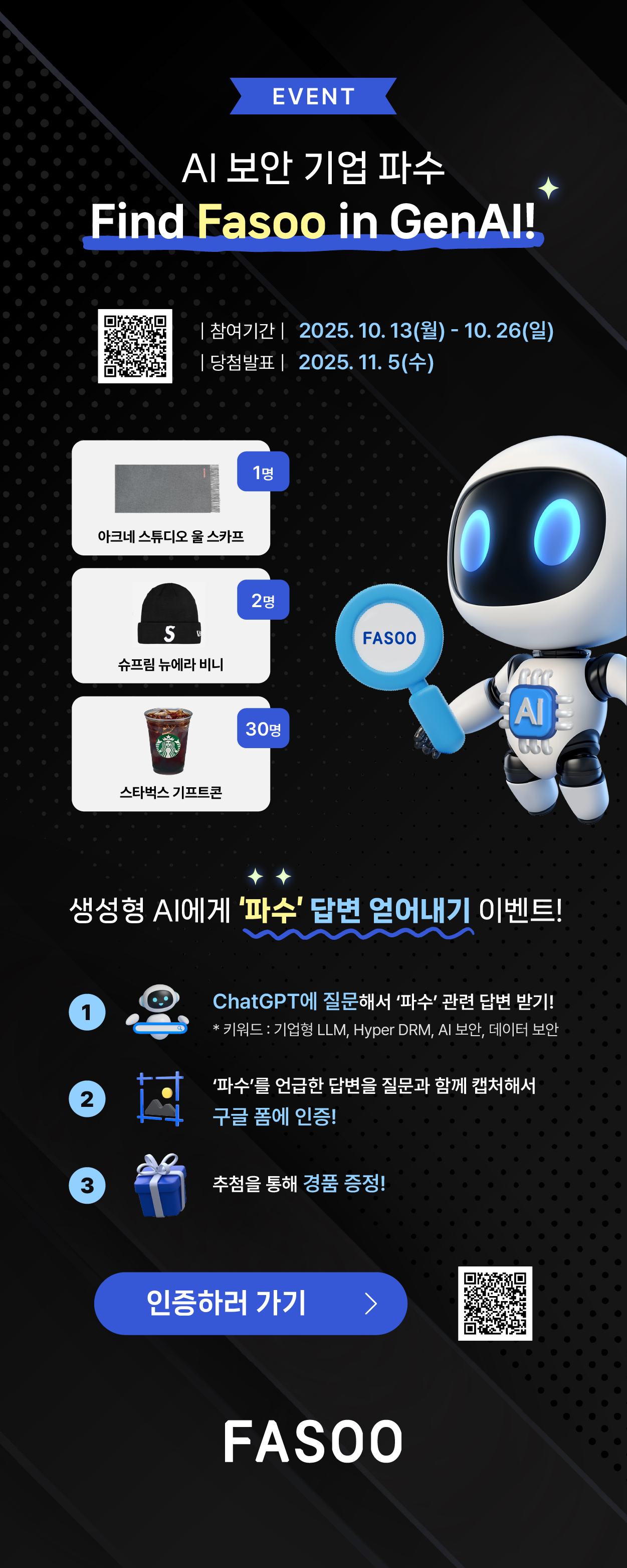 AI 보안 기업 파수! Find Fasoo in GenAI! 이벤트 참여하고 경품 받아가세요! (종료)
